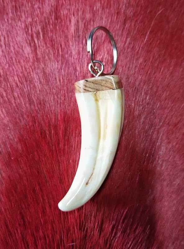 Beautiful handcrafted African warthog tusk keyring that has been highly polished and bleached and is about 3" in length. The warthog tusk keyring originates from Zimbabwe and has been obtain legally through the national game parks and wildlife service, no illegal gather. We can arrange to have bigger or smaller warthog tusk keyrings made for you so should you be looking for a certain size in this style of keyring email us and let us know.